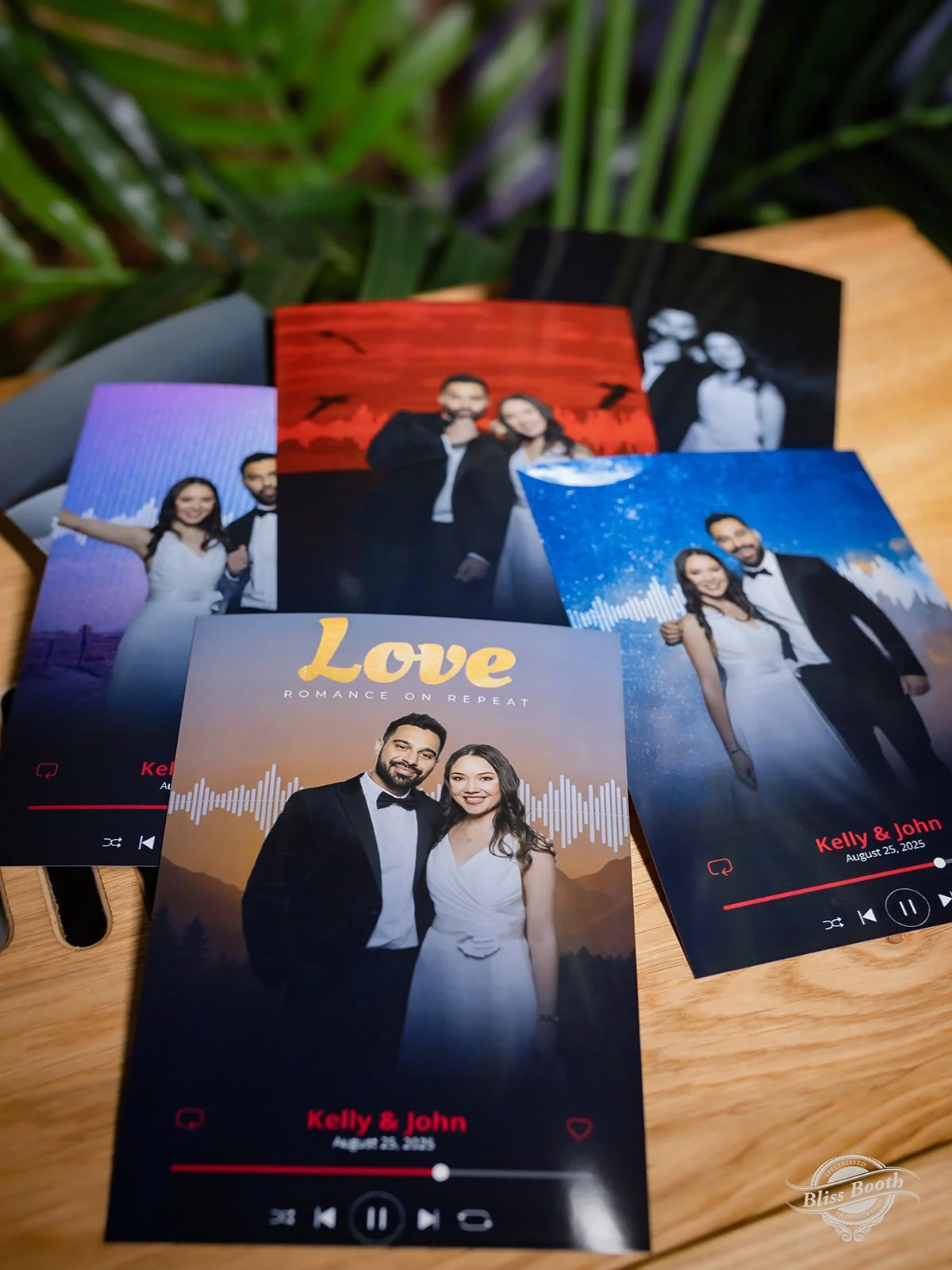 Each photo strip is designed with a stylish music-themed overlay that includes a Spotify code linking directly to the couple’s first dance song. Guests can simply scan the code on the print with their phone and instantly hear the song from that special moment.